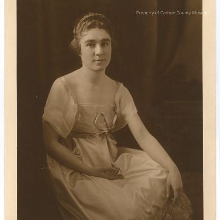 Update - 2009: A sepia toned studio portrait of a young woman wearing a dress with a square neckline & sheer wide sleeves. The bodice has horizontal tucks across the front. The lower half of the dress is of a satin look fabric with a ribbon tie around waist. Her dark wavy hair is in an updo & her right arm is resting in her lap. Her left arm is extended & resting on the left side of her leg.