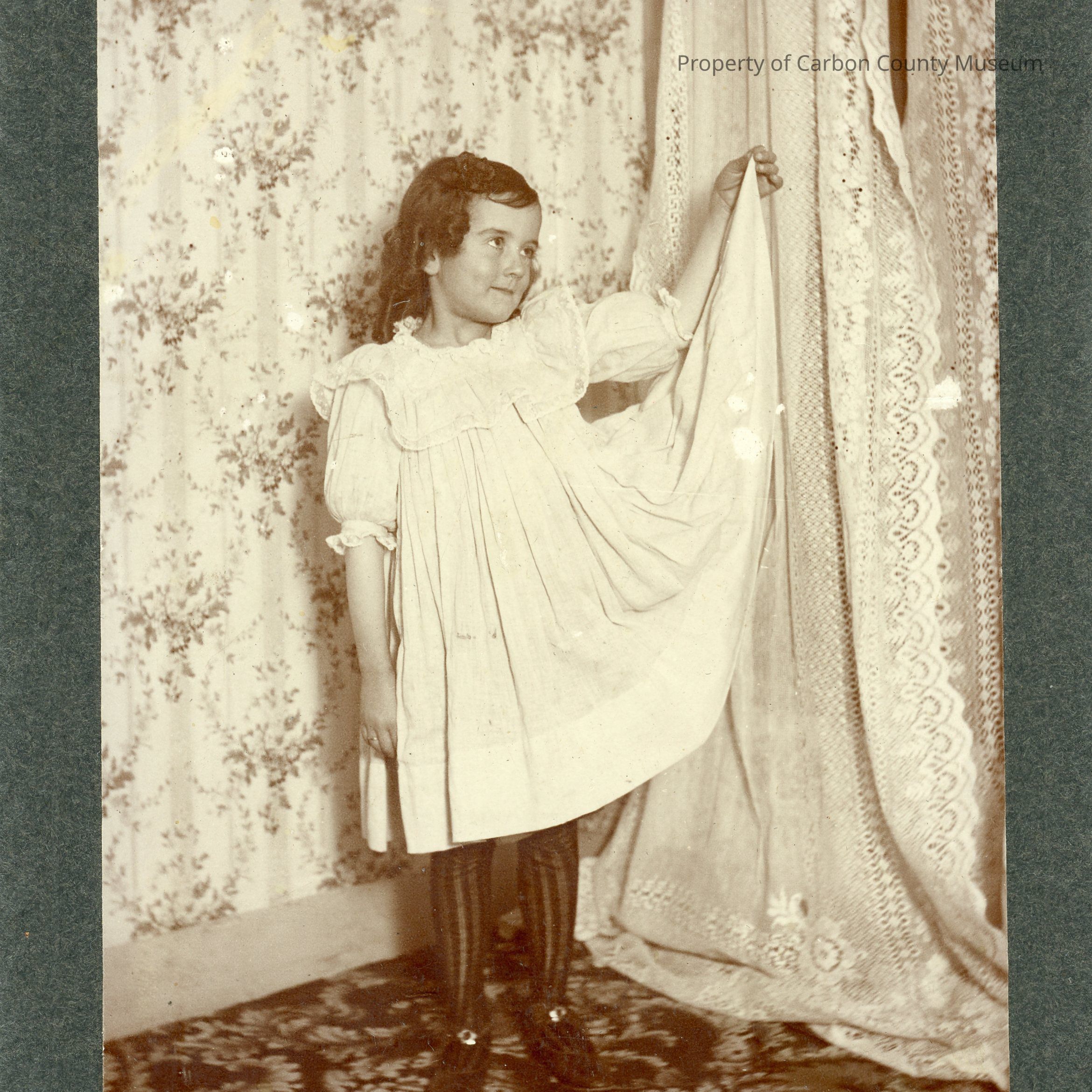 Update 2008: Black and white print. Photo of a young lady standing in a corner in a knee length dress. Dress is light colored and has a large ruffled collar that extends to her shoulders. She is holding the right corner of her dress in the air in her right hand. She has on dark socks and dark shoes. Sleeves of dress come down to the elbow. Her dark hair is in ringlets. There is lace full length curtains to her right and flowered wallpaper to her left. Floral carpet on the floor.