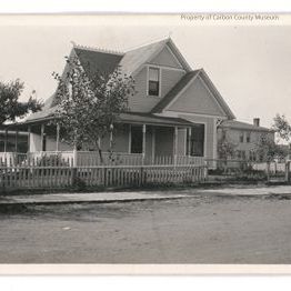Update - 2009: Two original black & white prints of a medium toned 2 story wooden frame house with a large white wrap around porch on front & side left of house. Multi-dimensional roof with double upside down V look at top of house front. A white picket fence is at side left photo with young trees in yard. A wire fence with gate is to photo right of picket fence. A wooden plank sidewalk extends the width of the print in foreground with a dirt road in extreme foreground. Other buildings are seen in background side right.
