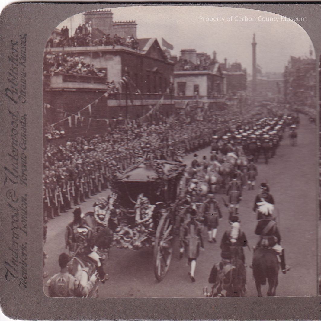 No #, The gorgeous Royal Coach carrying the newly crowned Sovereigns up Whitehall to the Palace, London, England, 1902