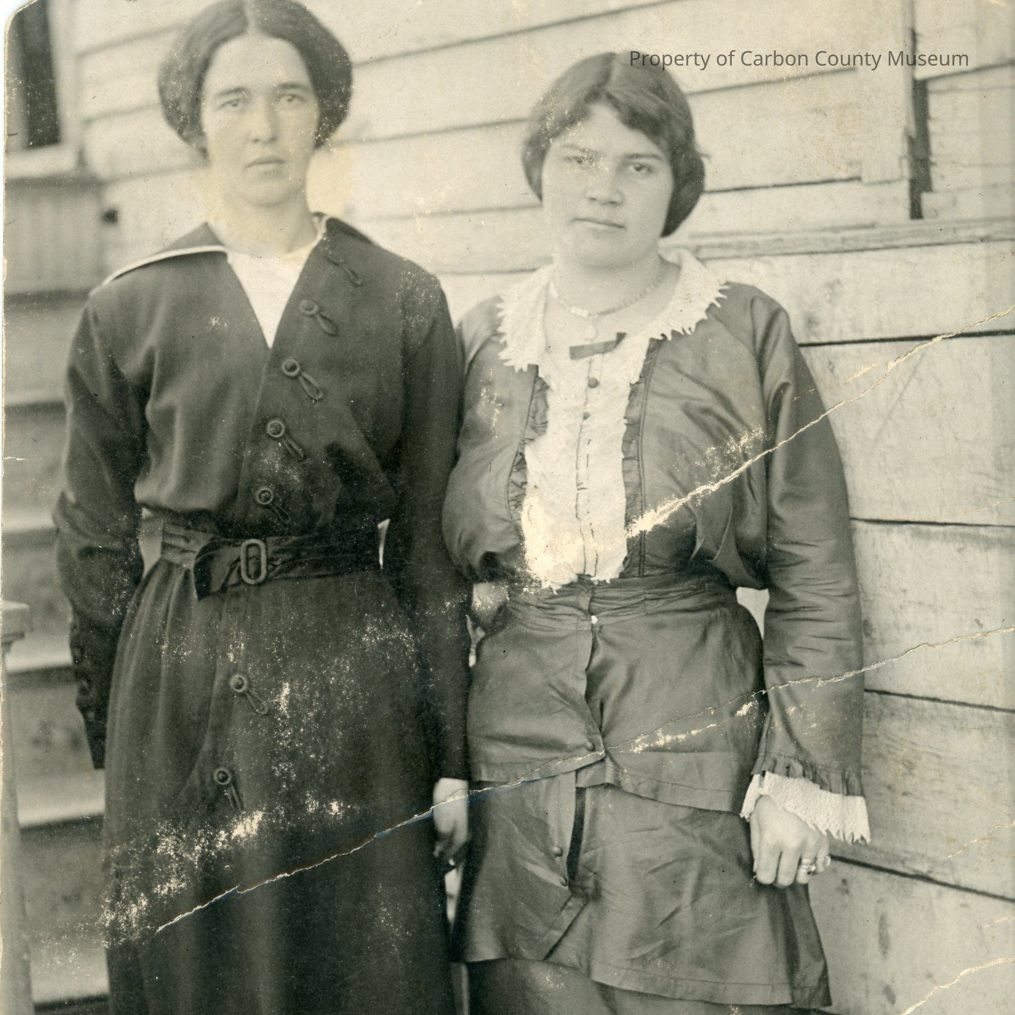 Update 2008: Black and white print. Photo of two ladies standing at the foot of outside stairs. Lady on left has on black long dress with buttons down past waist. Belt at waist. V shaped opening at neck with light colored insert. Long sleeves. Her hair is parted in middle and combed back in a bun style. Second lady on right has on two piece medium dark dress. Skirt is long. Jacket comes halfway down skirt and buttons up front to waist. Sleeves are long and have light colored ruffles at wrist. Jacket is open showing a ruffled light colored shirt that buttons all the way up. Shirt has ruffled collar. Lady has on a necklace and her hair is also parted in the middle and combed back in a bun style.
