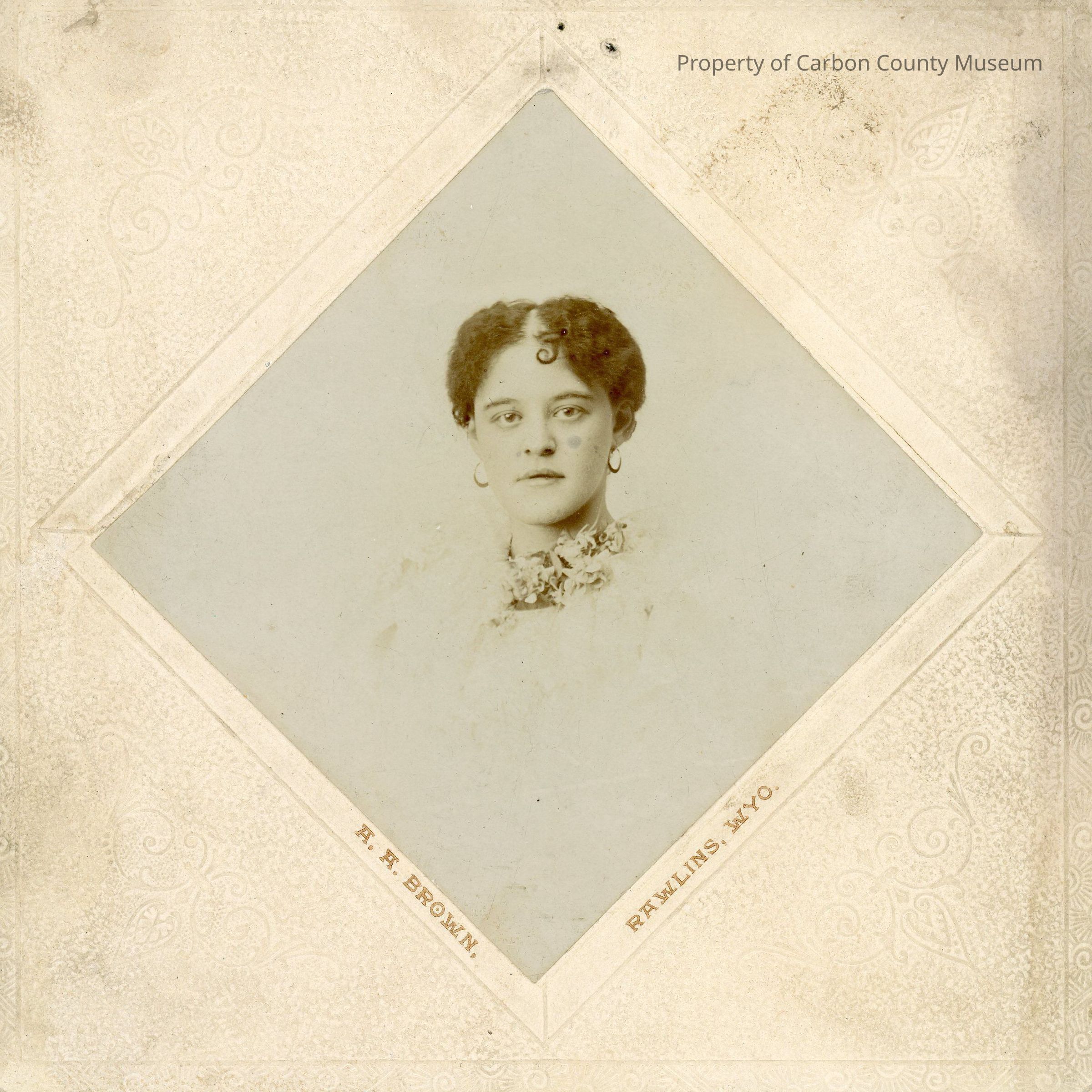 Print is mounted on light colored matboard. The photo makes a diamond shape on the matboard. There is a small indented diamond shape around edge of photo. Printed on left bottom of indented diamond "A.A. Brown" Printed on lower right edge of indented diamond "Rawlins, Wyo". Matboard is badly soiled around edges. Slightly soiled on the rest.Collection