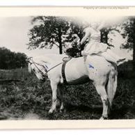 Update - 2009: Black & white print of large white horse with a woman sitting on horses' hind quarters with her legs extended over the tail. Horse has wide strap around stomach with another attached holding its head down. Woman has on a tutu and tights.