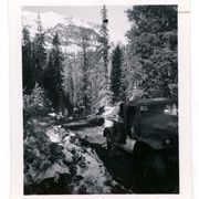 Update 2009: Black and white print of vintage car on narrow road. There are tall pine trees on road sides and mountain in background. In distance on road are two men leaning over working on unidentified object. Snow is on photo left side of road.