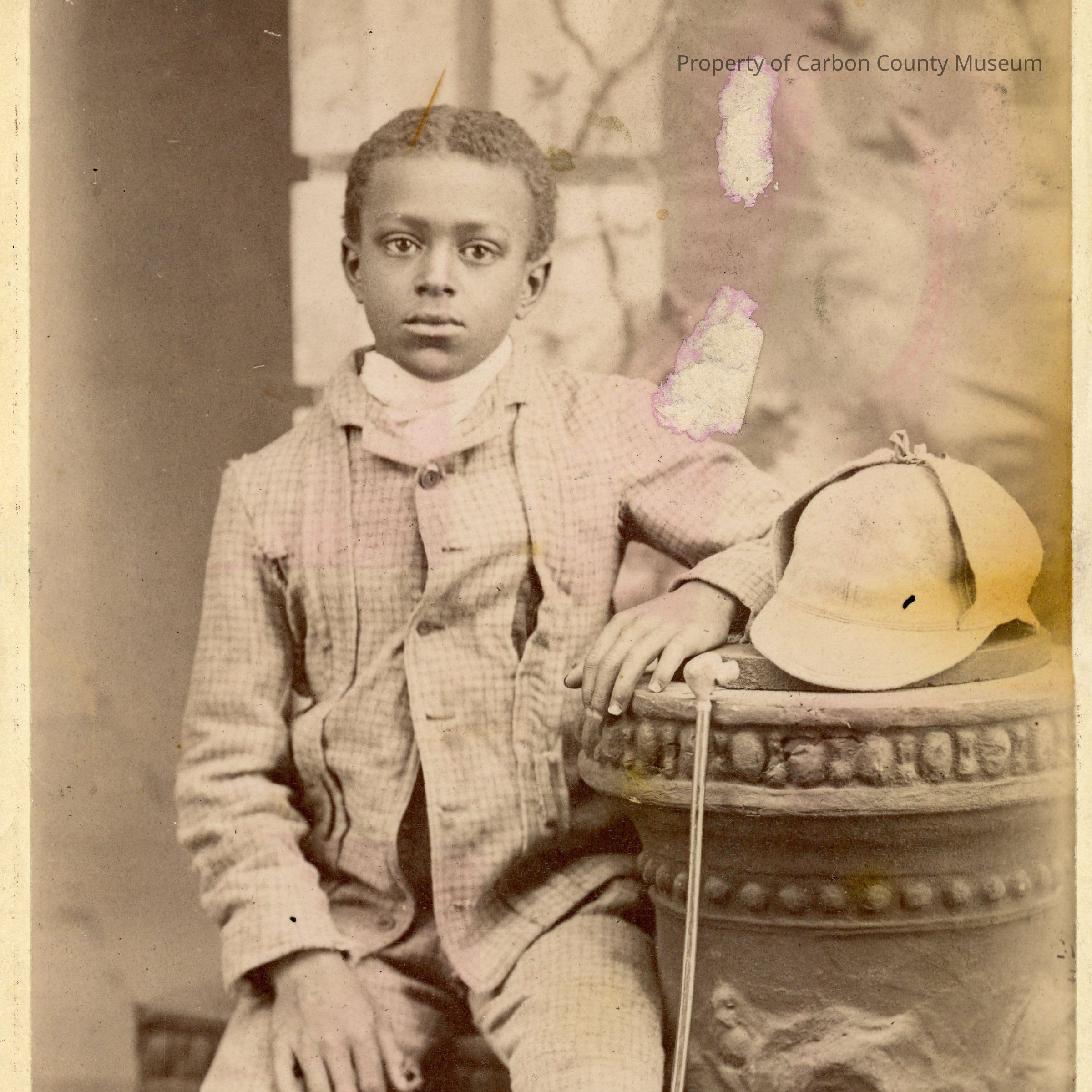Update 2008: Sepia print. Photo of a young African American boy sitting on a seat next to a small round table. His right arm is resting on the table. He has on a light colored pin stripped jacket and short legged pants. He has on stripped knee socks. He has on a light colored round collared shirt. His hair is parted in the middle and is cut short with waves all over. He has a cane leaning up against the table and a Sherlock style hat on the table.