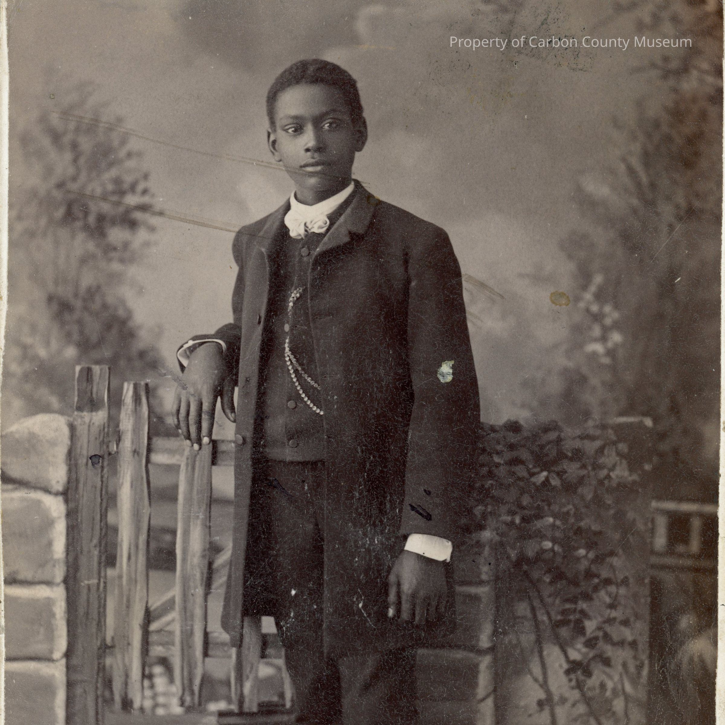 Update 2008: Black and white print. Photo of a young African American boy standing in front of a studio wooden crate. Young boys left arm is resting on the crate. He has on a three piece dark suit with watch fob attached to vest . Round collar, white shirt and bow tie. Short hair parted in middle.