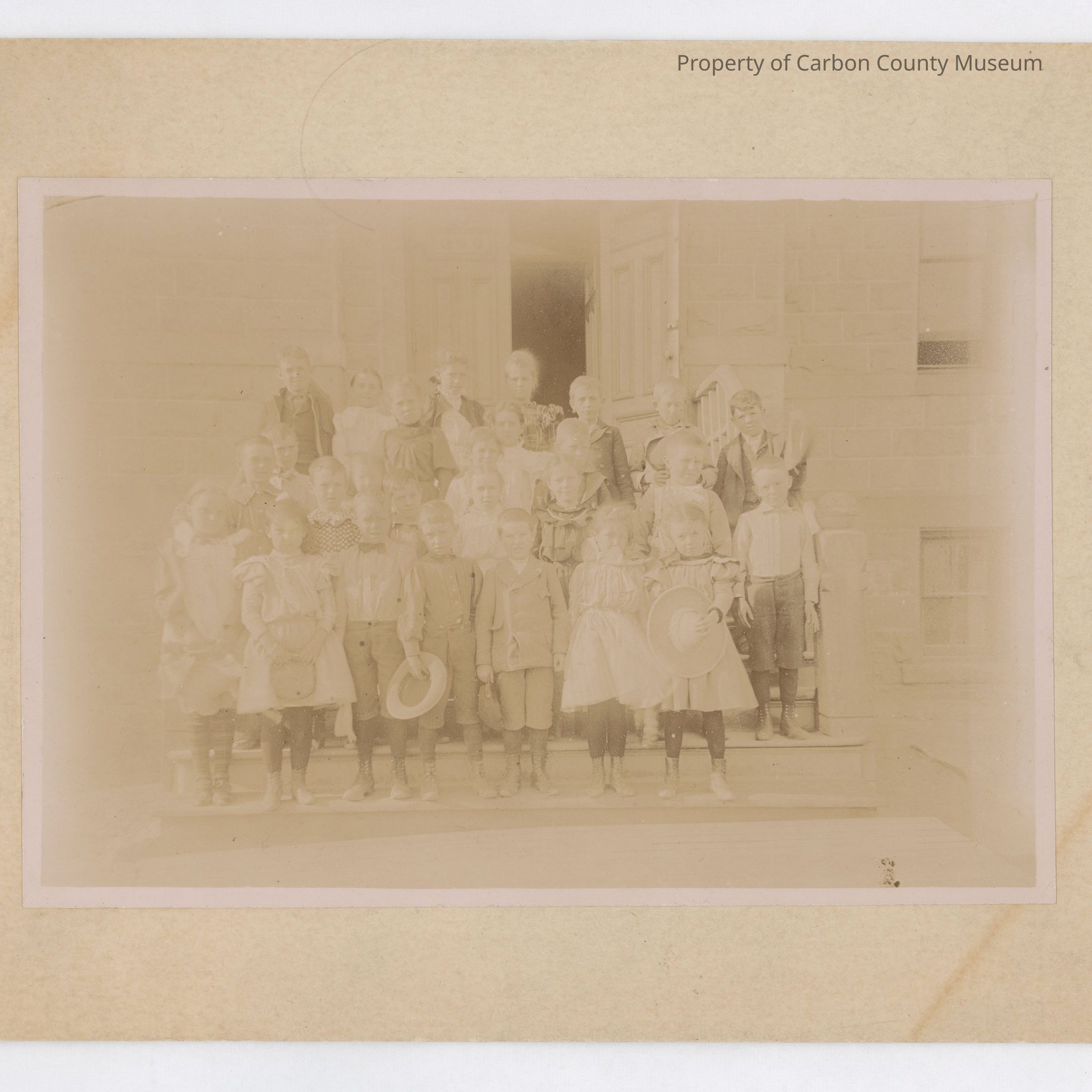 Update - Aug 2010: Sepia print on a cream colored mat. Four rows of young children are standing on the steps of a school building in tiers leading to wood double doors. Several children are holding hats in their hands in front of them. Girls are wearing dresses with dark tights & lace up shoes. Boys have on knee pants, some with jackets or bow ties & dark tall socks & lace up shoes. Photo right door to school is open. Building is cut stone with upper & lower windows on photo right. Step wood railing & post are to photo right of children.