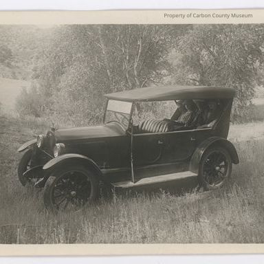 Update 2009: Black and white print of vintage car setting in grass and tree area with three people sitting in back seat of car. Car has dark tires, spoke wheels, running boards, two doors on each side, open side windows, canopy top. There is a rifle setting on running board leaning against car.