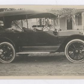 Update 2009: Black and white print of vintage car. Side view of car that has spoke wheels, two doors, two seats, open side windows and canvas looking top. It is sitting in front of a house with a picket fence. Condition good. Corners bent.Collection