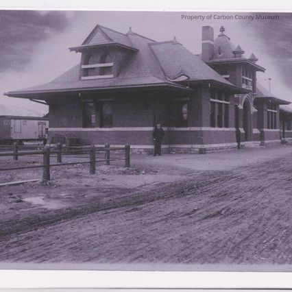 Update - 2009: Three black & white scanned copies of Rawlins Depot. Building has ornate roof with a dormer in end, two spires above door, uneven roofs protruding from main roof & a steep axillary roof above entry, cupola shaped with a decorative top. A man stands at corner of depot wearing a dark suit & hat. A wood wheel wagon is parked at end of the depot & train cars are behind the building There is a fence at either end of depot along a dirt street. A water tower is seen in the distance.