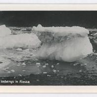 Print 5. Icebergs. There are three larger ones and many small ones in shallow water. Dirt or mud can be seen in foreground. Printed on bottom in white ink: "Icebergs in Alaska". Condition good.