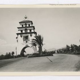 Print 1: Image of highway going under arch bottom, multi level building. Sign on building says "Hotel 1 Agua Caliente". Level of building above arch has a balcony and awning. Next level is narrower and has a bell in arched opening with decorative marking along roof line. Next level is narrower still with a bell in arched opening and decorative markings along roof line. Top roof looks like tile and has an arched gazebo with spiral top. There are date palm trees and large decorative pots on both sides of archway .To photo right is a white building with dark roof and turrets on corners. Large concrete drive way on right of archway. Condition is good. Small spot on front.