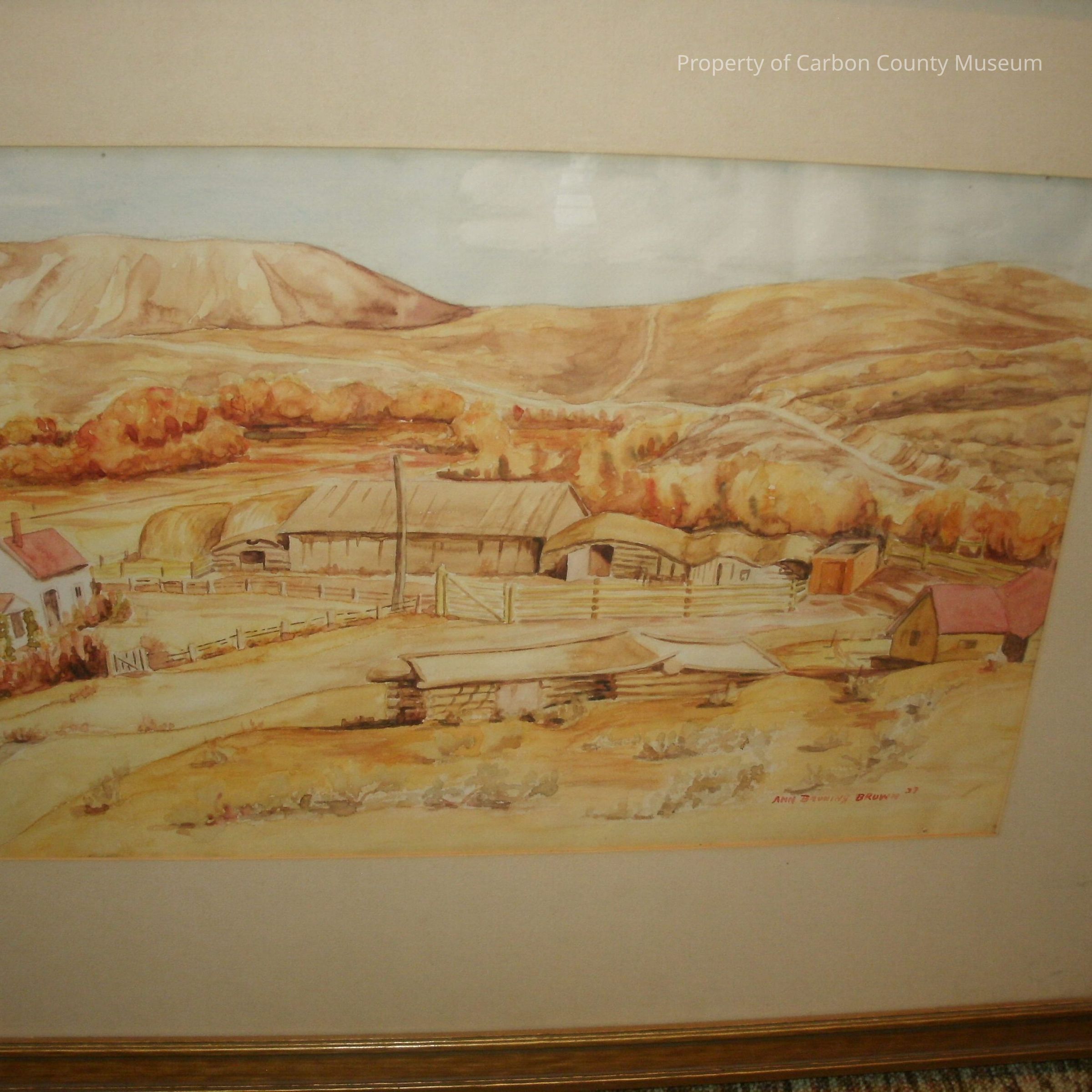 Matted and framed watercolor painting of the Sulphur Ranch, an old stage station on the Overland Trail. The painting was done in the fall of 1937 by Ann Bruning Brown, granddaughter of Ann and John Robertson. Shows a white house with red roof, several outbuildings and barns set in front of a small flat hill with dirt roads and brush.