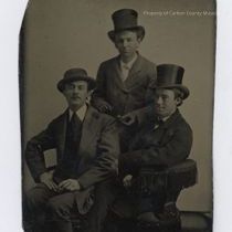 Update 2009: Black and white studio print of three well dressed men. All have on suits and ties, white shirts and hats. Man standing behind is holding a small unidentifiable object in his left hand, his hat is narrow brimmed and tall crowned. Man seated on left has on a Derby hat. Man seated on right has on a narrow brimmed and tall crowned hat and his arm rests on a photographers chair. The arm of the chair has long fringe.