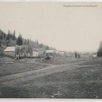 Update 2009: Black and white print of row of buildings against a timbered hill, they are behind a dirt road. Second building in row has sign that reads: "Rambler Club" " Saloon". A row of barrels sit in front of 1st building. Board walks and wood steps lead up to building fronts. Behind row of buildings is a house and two small out buildings. On photo right are larger log buildings, a large pin tree stands to photo front of log buildings.