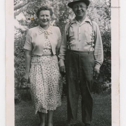 Black and white glossy picture of Mr. and Mrs. Ed Larson standing outside. She is wearing light print dress with jacket. He is in shirtsleeves and hat. "Ed Larson wool hat , Zumbrennen in-law" written on back of photo.