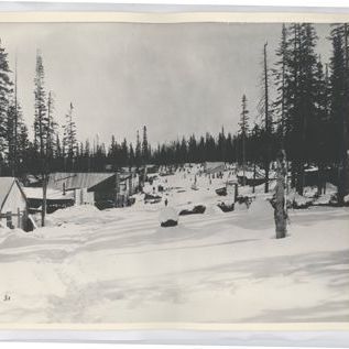Update - 2009: Black & white print. Image of a town, comprised of wood frame buildings under deep snow. Trees and tree trunks all around. Snow has piled up nearly to roof level.