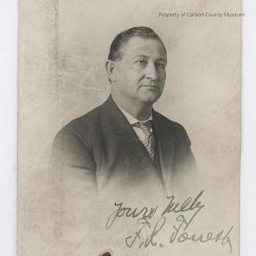 Black & white print card of well dressed man. He has on a dark suit, white shirt & print tie. Written on front in black ink: "Yours Truly F. L. Forrest, Iola, Kansas"