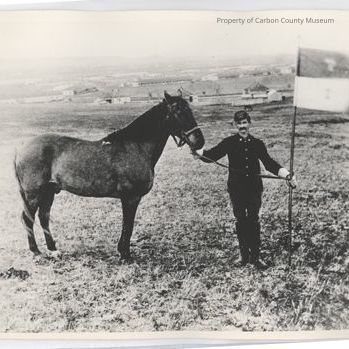 Update 2009: Black and white print of horse being held by reins by a soldier. The soldier also is holding flag on a pole, his right hand is under the chin of horse with the reins extending to the soldiers left hand which holds the end of the reins and flagpole. They are standing a top a hill with a fort in background. The soldier is dressed in dark uniform and hat with military insignia on front. he has on white gloves that extends up his arm.