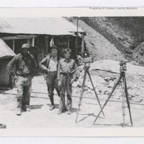 Update - 2009: Black & white print of three men standing next to tripod survey equipment. Man on left is dressed in work clothes & boots & a hard hat. Man in middle has on dark pants with suspenders, dark jacket & hat & light colored shirt. He wears glasses. Young man on right has on dark slacks, belt & work shirt. A building is in background left & cloth or tarp bags laying in background right.
