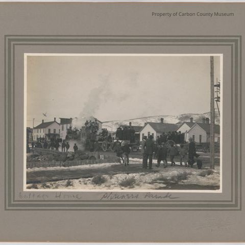 Old black and white photo of "Shriners Parade", numerous men walking down Buffalo west between Fourth and Fifth streets. Cottage Hotel in the background and Clause's used barrels in the foreground. Men in parade are riding on a steam tractor pulling wagons. Appears to be fall or winter as there is snow on the hills in the background. Photo is mounted on heavy gray-green cardboard and is in good condition. "The Ferris Studio, Rawlins, Wyo." embossed on base of cardboard.