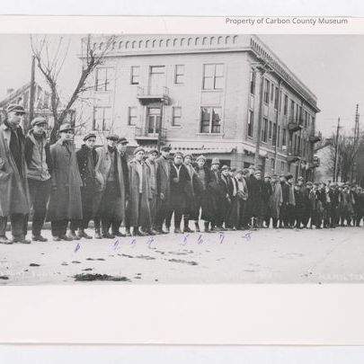 Update - 2009: Black & white print of line of men standing in front of a multi level building. The men are wearing long coats, scarves, sweaters & hats. The building has awnings on the bottom floor, they are rolled in. The second & third levels have a lot of windows & small balconies surrounded by iron railing.
