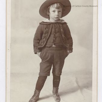 Update - Aug. 2010: Two black & white prints on white mats. Image of a young boy. He is dressed in a large brimmed hat, three piece suite with soutache braid on jacket lapels, short pants, dark socks & button up shoes. A white shirt collar lays over a wide jacket collar. His hands are in his pockets.