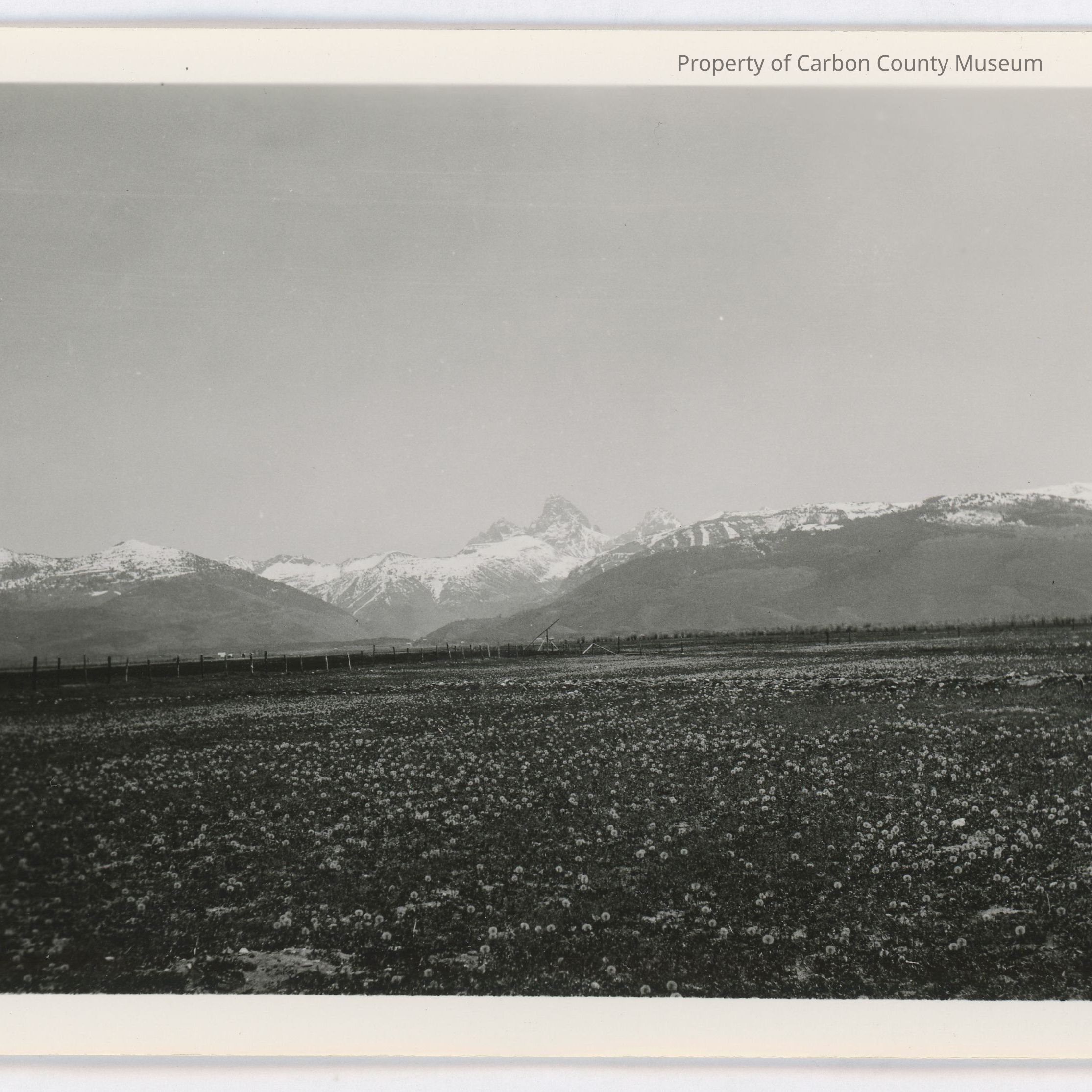 Print 12. Teton Mountains in distance, lower mountains behind corral fences. In foreground is field of white dandelion looking blooms. Condition good. Small poke hole. Size 3 1/2 x 5 3/4.