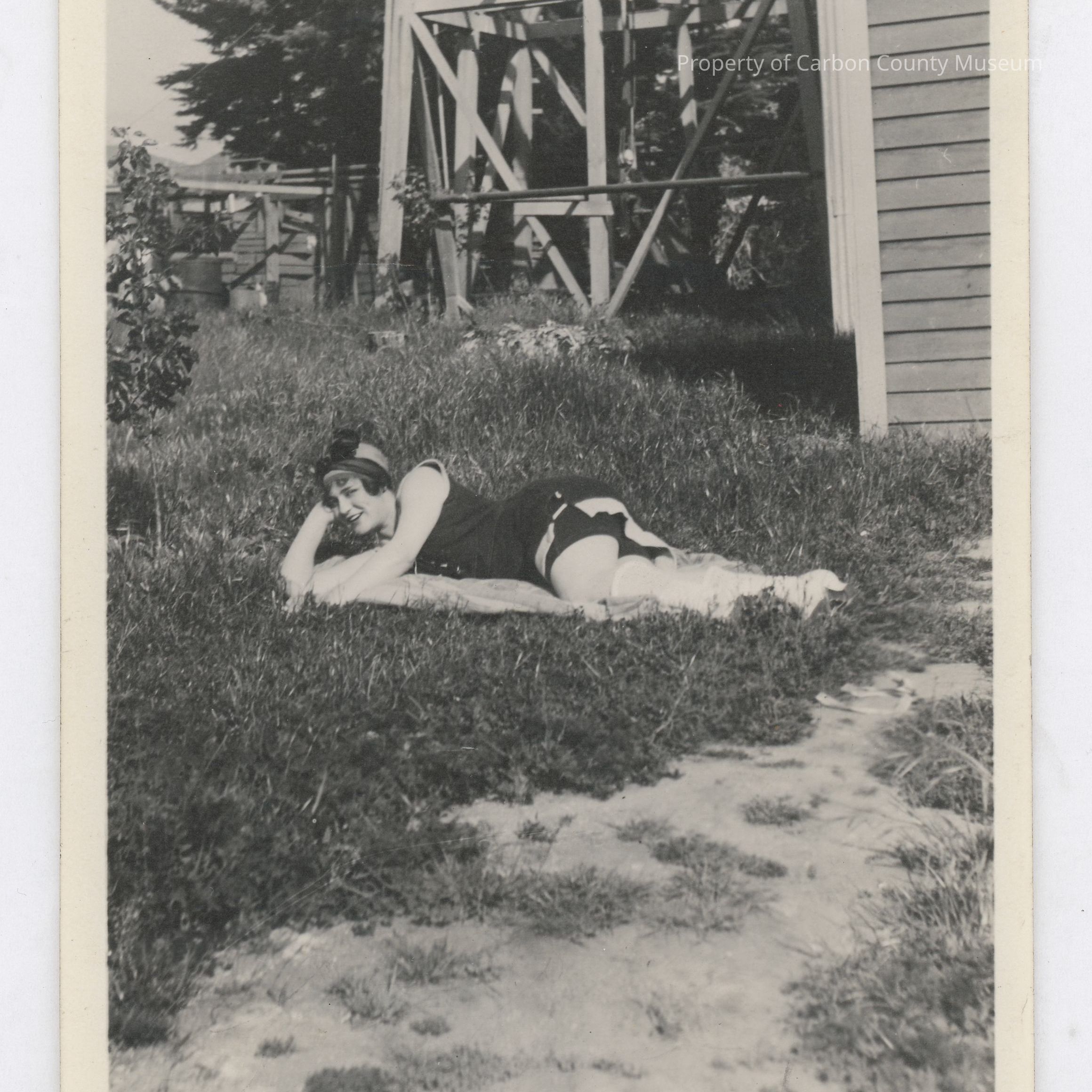 Update - 2009: Black & white print of lady lying on a towel on the ground. She is wearing a dark swim suit trimmed in white, a hat, knee high stockings, & white heels. A frame structure is behind her & it is connected to a clap board building. Grass surrounds lady & large trees are in background.