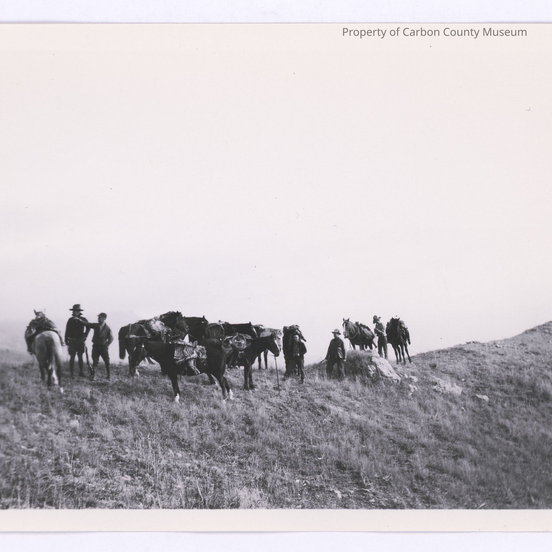 View 39. Men & horses on a ridge. Second man on left is pointing with outstretched arm toward photo left. Man standing to his right is looking in that direction & holding a rifle, butt on ground. Some of the horses are carrying large packs. All men are standing on the ground beside their horses. Men are wearing coats & hats.