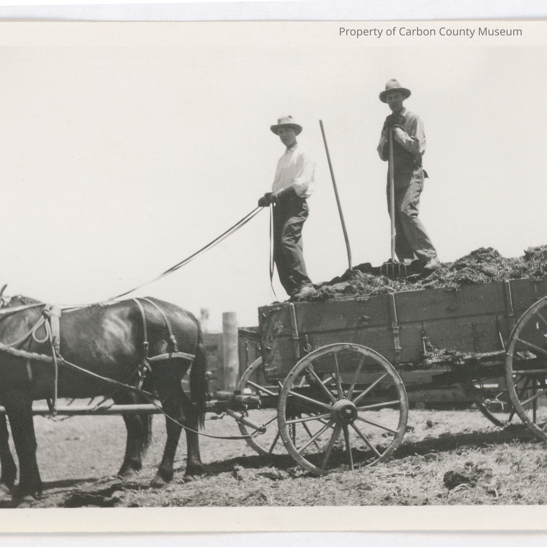 Print 11: Two men standing on top of loaded wagon, one holding reins to harnessed horses, one leaning on hoe stuck in dirt looking load on wagon. Another hoe is stuck in load behind man holding reins. Written on back in pencil: "Revelle". Condition good. Size 3 3/8 x 5 7/8.