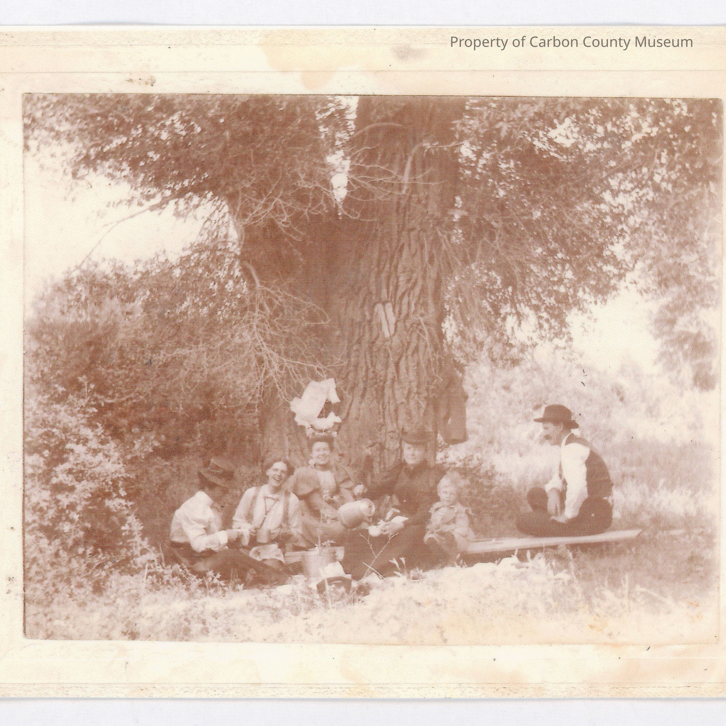 Update - Aug 2010: Sepia copy print of six people on a picnic. They are seated on a board on the ground in front of a large tree. From right to left; a lady in light colored, long sleeve blouse, long dark skirt & tall hat, another lady in a light colored long sleeve blouse, suspender looking straps on her shoulders, a necklace & holding a tin cup or bowl in her hand, next a lady has on a pouffy sleeve dress, next a lady in a dark, long dress & hat, she is pouring from a large coffee kettle into a cup. Sitting next to her is a child with light hair & medium colored clothes. Last a man looking toward photo left at woman. He is wearing dark hat, vest & pants & a light colored long sleeve shirt. An unidentified white object hangs in the tree behind them & a pail is in the ground in front of them.