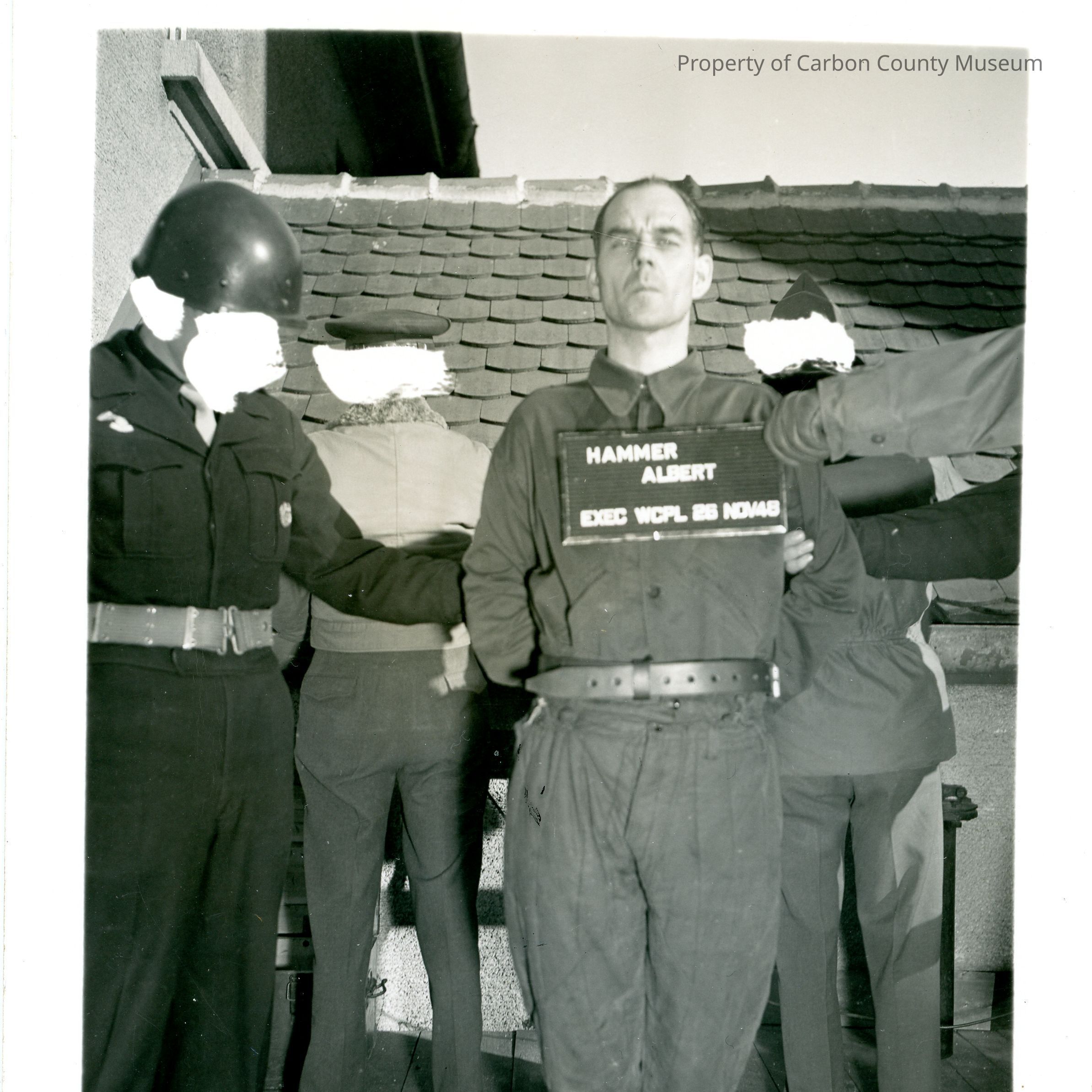Black and white photograph. A man wearing a prisoner uniform is held in place by two men - one man is out of frame while the other is wearing a military uniform and has his face scratched out. Behind the three are two more men wearing military uniforms with their backs to the camera, their heads are scratched out. A placard held in front of the prisoner reads "Hammer Albert EXEC WCPL 26 NOV 48".