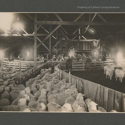 Update 5/2010: Black and white print on black mat of sheep inside a large building. Sheep are sectioned off with a wood slat fences. A group of men stand and sit in a circular pattern along fences in photo center. Four men are sitting on a platform above others. Large rafters hold up a tall roof.