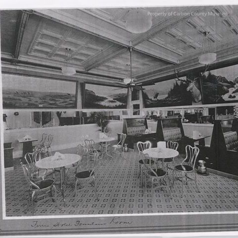 Black and white scanned image of the Fountain Room in the 1920's. Photo shows three round tables, four booths, scenic outdoor murals on walls and mounted deer head on the wall. Ceiling fan in upper center of the photo. Patterned tile floor in foreground.