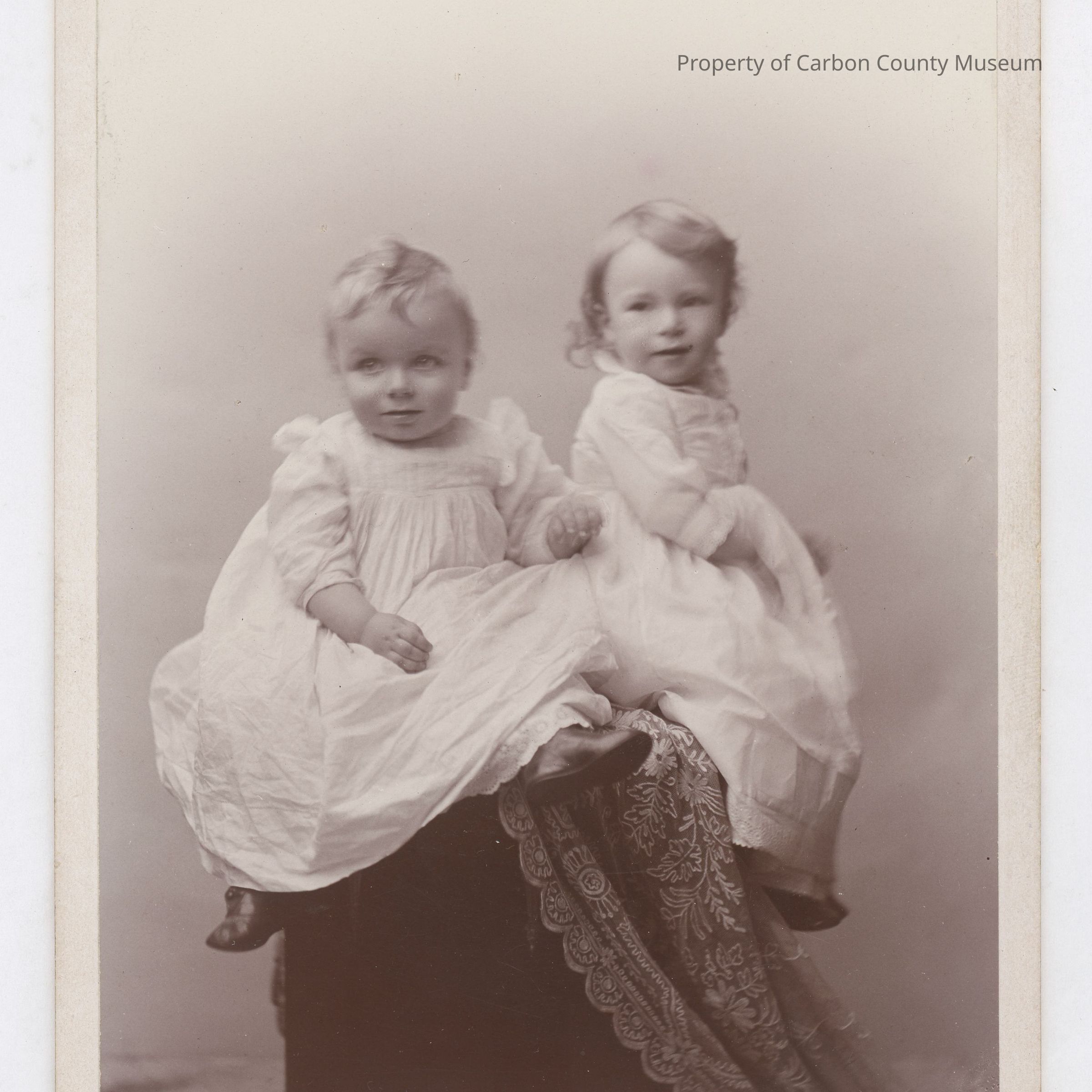 Update March 2011: Black & white studio portrait on a white mat. Image of two very young children sitting on an unidentified object with an embroidered cloth draped over. They wear light colored gowns with lace & embroidery trim, the child on left has on dark shoes. They both have light colored hair with curls in the ends.