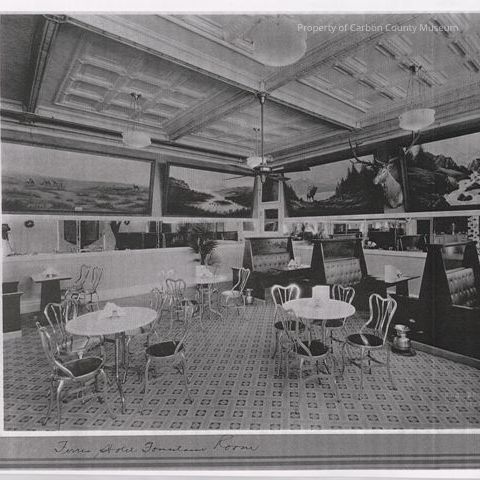 Black and white scanned image of the Fountain Room in the 1920's. Photo shows three round tables, four booths, scenic outdoor murals on the walls and a mounted deer head on the wall. A ceiling fan is located in upper center of the photo. Patterned tile floor in foreground. Photo is identical to #2001.868.0001.