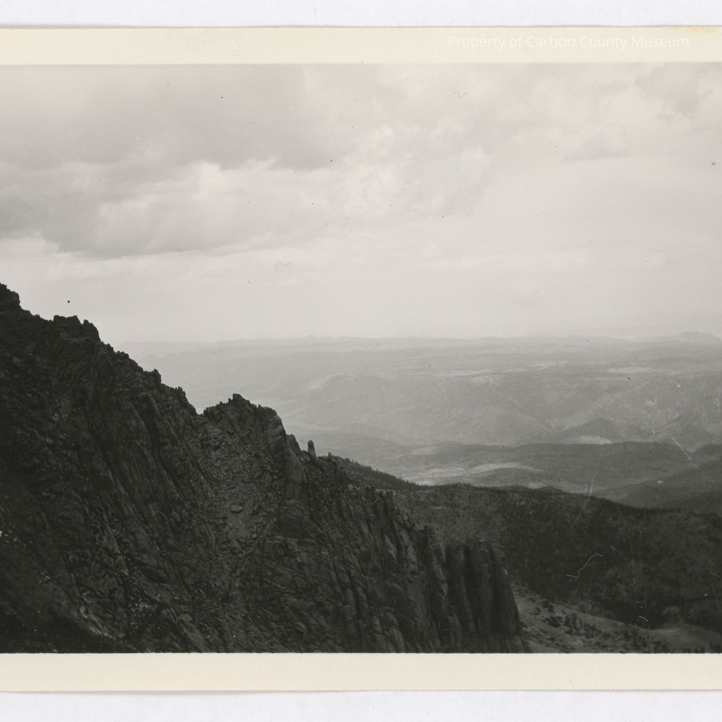 Update 2009: Black and white print of birds eye view of mountain ranges in background covered with a light dusting of snow. On photo left is a sharp, jagged rock cliff. Heavy clouds are in the sky.
