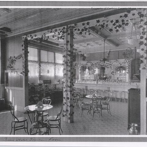 Black and white scanned image of the Fountain Room in the 1920's. Two round white tables located in the center of the room. One table in the left foreground and the second table located in the middle of the picture. Soda fountain located in the center background. Radiator and glass display case seperated by a wall located on the left side of photo. Spitoon and a record player located in the right foreground . Leaf garland draped around archway and load bearing pillar in mid center of photo.