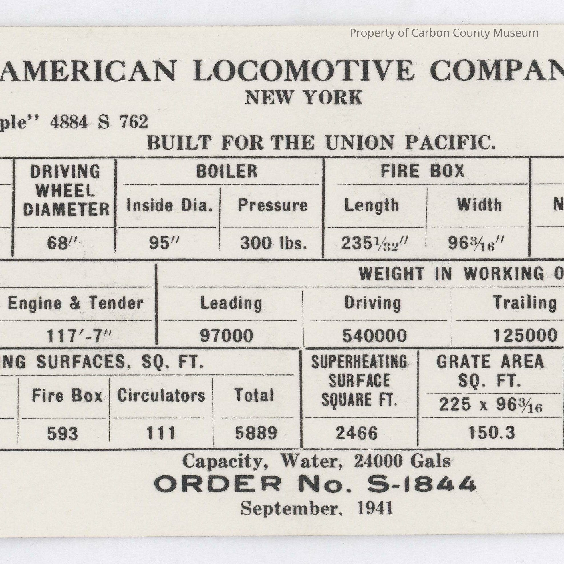 B/W photo of Union Pacific locomotive #4002 with tender. This locomotive was a Big Boy. Printed on back in black: "American Locomotive Company New York" "Order No S-1884 Sept. 1941" "Built for Union Pacific" "Road #4002" Back of print also includes type specifications for the train.Collection