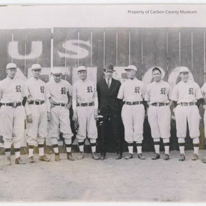 Update 5/2010: Black and white print of a baseball team. There are ten men in uniforms and 1 man in a dark suit and hat. The uniforms are light colored with an R on the left chest area, dark belt and knee length knickered pants, white socks with a wide dark stripe near the top and dark lace up shoes. They are standing in front of a tall wood fence.