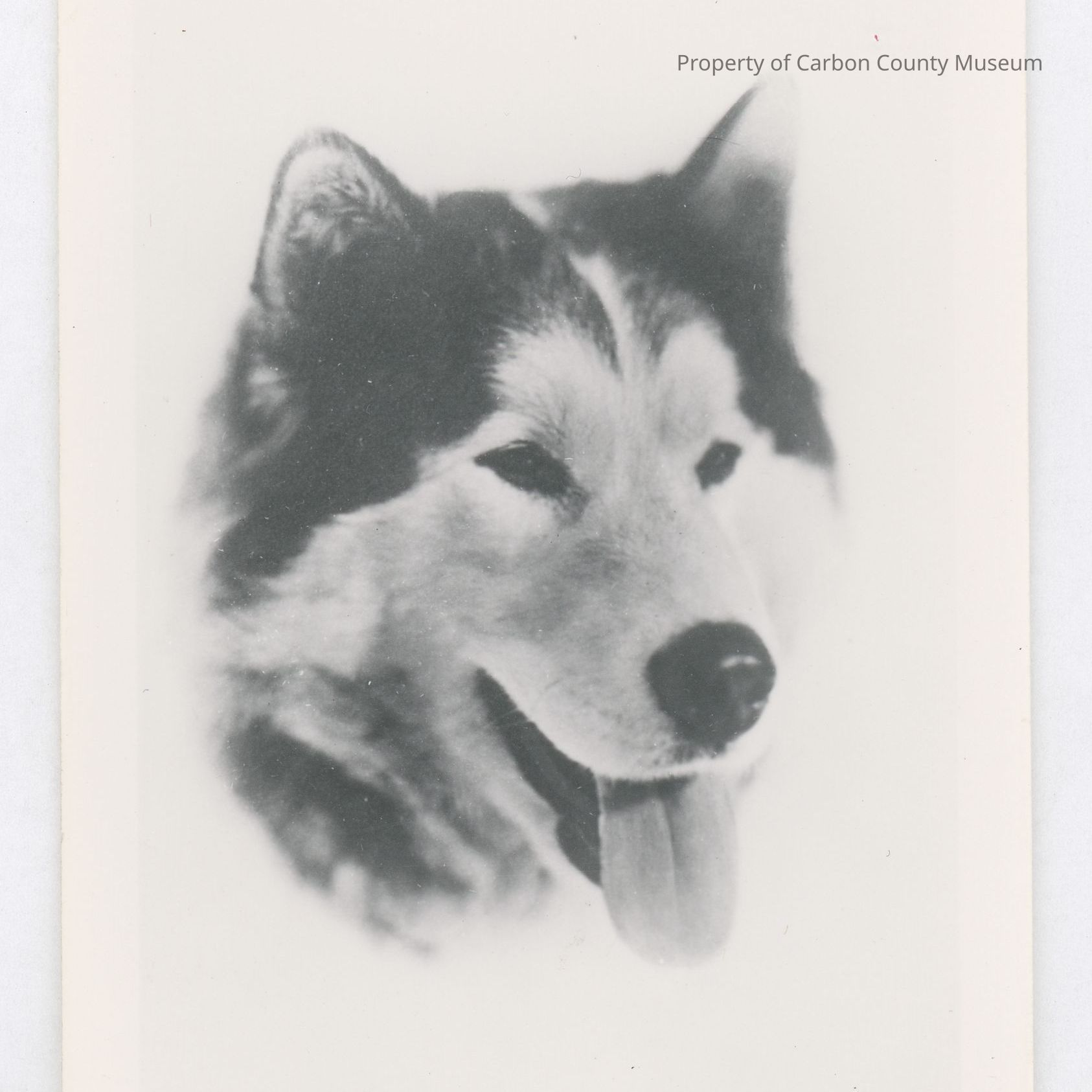 Update - Aug. 2010: Black & white print of head of a Husky dog. His tongue is hanging out, his ears erect. He is lighter color on his nose, around & above eyes & jaw line. His head is dark with a light streak along the top of the head. the inside of the ears is tipped with light color.