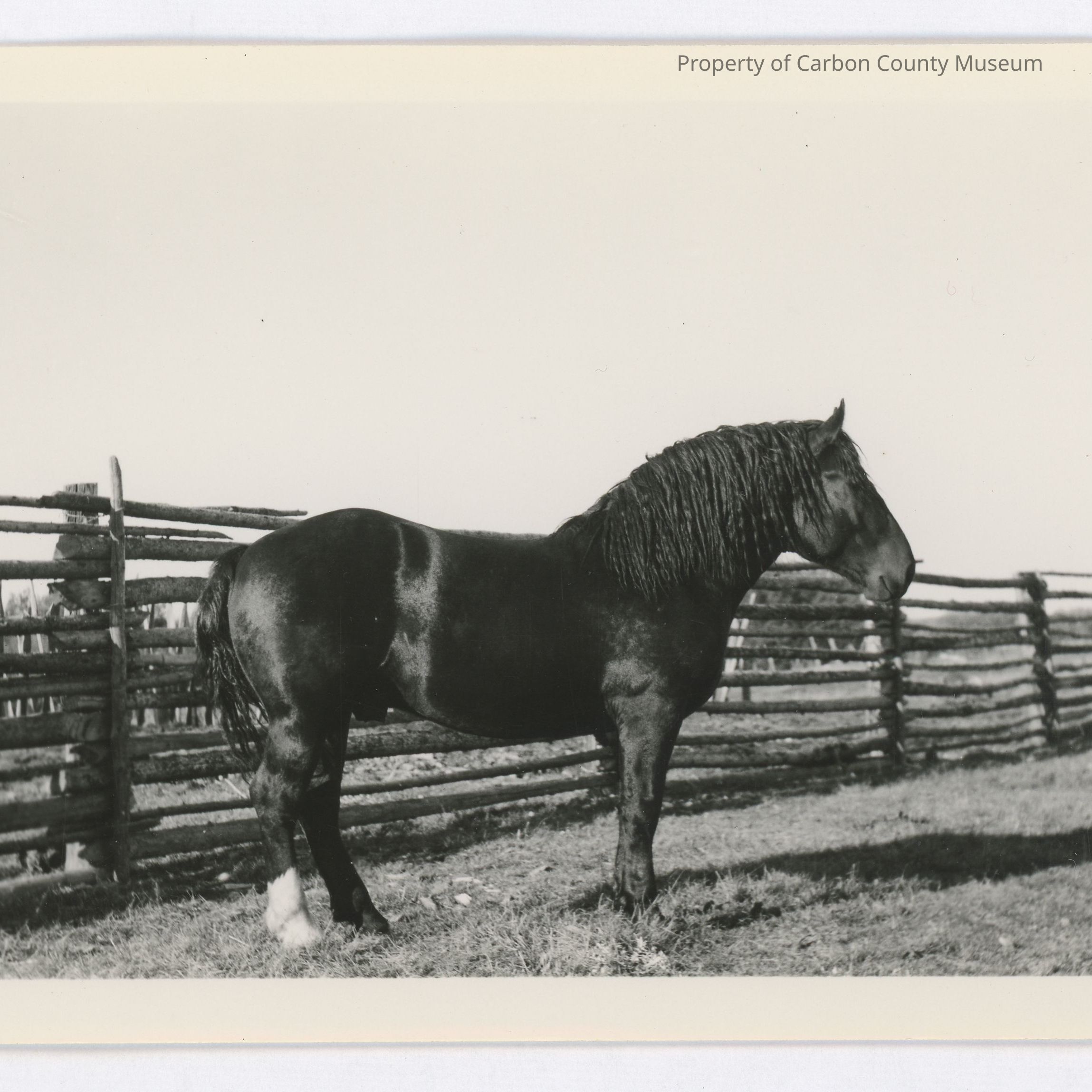 Update 2009: Black and white print of a large dark colored work horse standing in front of corral. The horse has white right back foot. High corral is made ten poles tall. See also 1949.068.380.