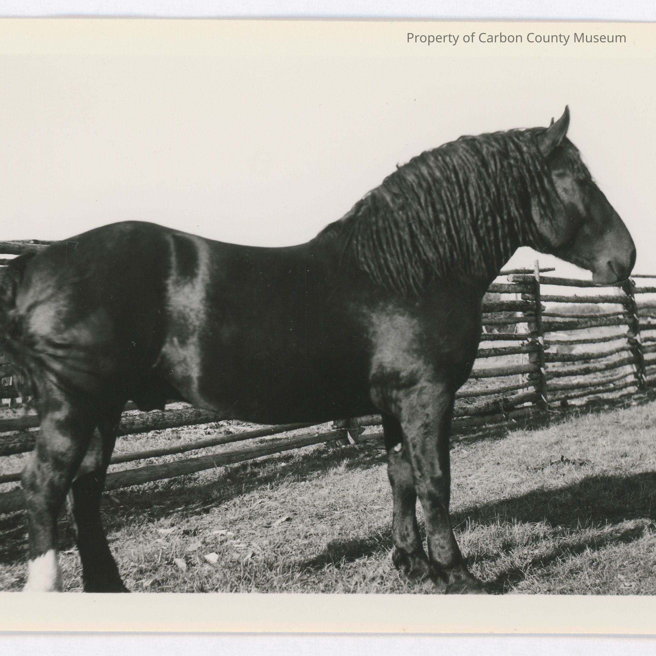 Update 2009: Black and white print of a large dark colored work horse standing in front of a pole corral. The horse has right back foot that is white. Corral poles are 10 poles high. Horse main is thick and curly.