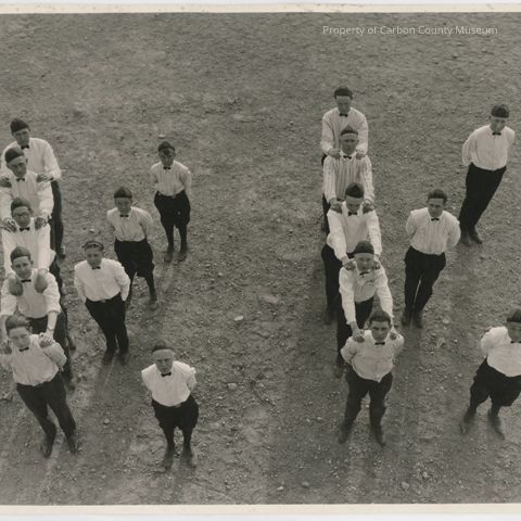 Original black and white photo from 1923 Roundup. Seventeen young men in black pants, white shirts and beanie caps standing in lines to form the letters K and K.