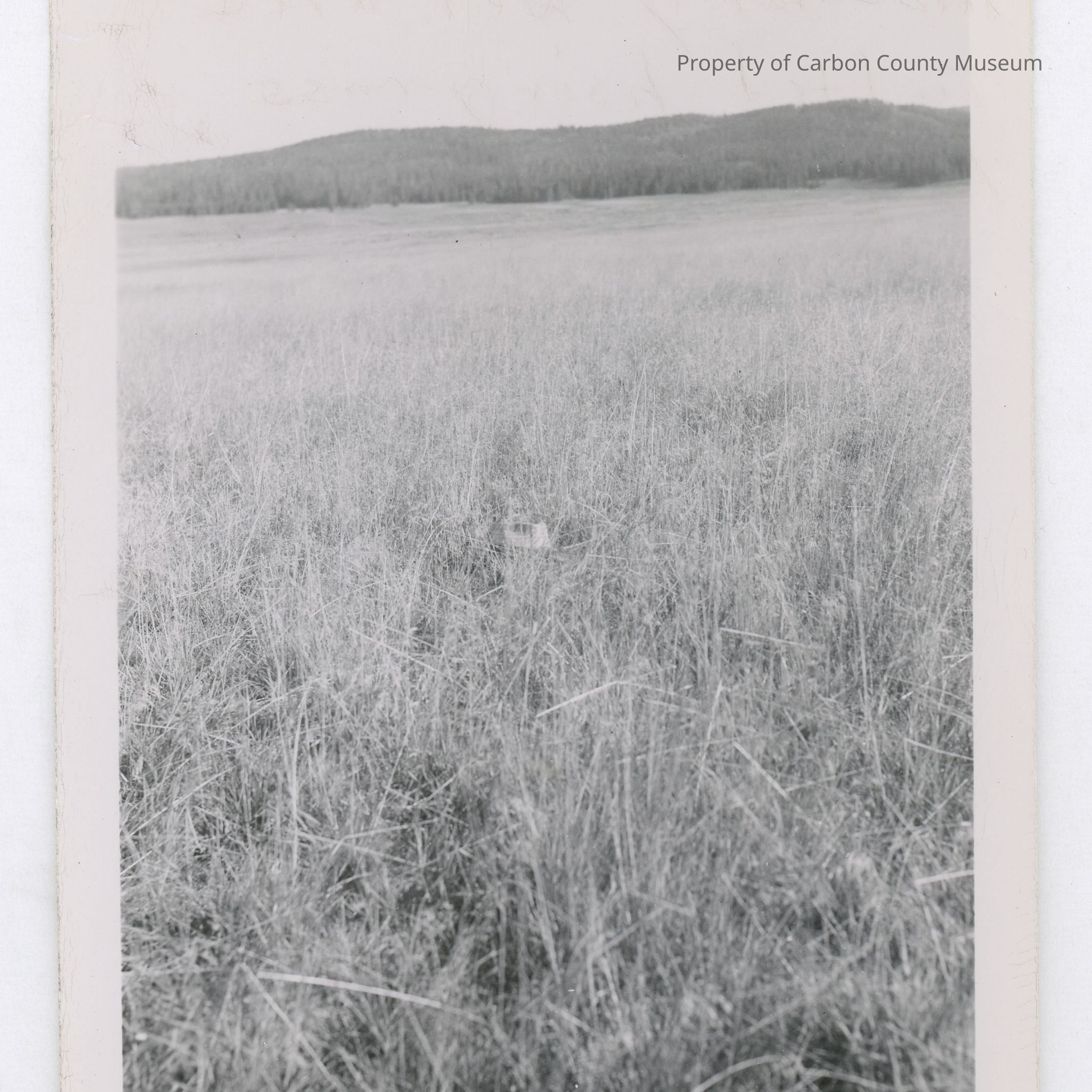 Update 2009: Black and white print of grassy field. Trees and hills in background. Written on back in pencil: "Big Red Park moderately wet acres and tufted hairgrass Aug 17-1946".