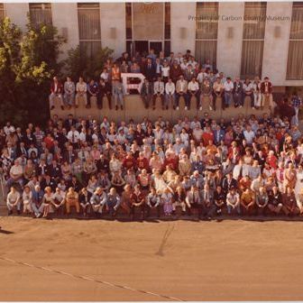 Glossy color photo of the "R" Club reunion if front of the Elks Club.