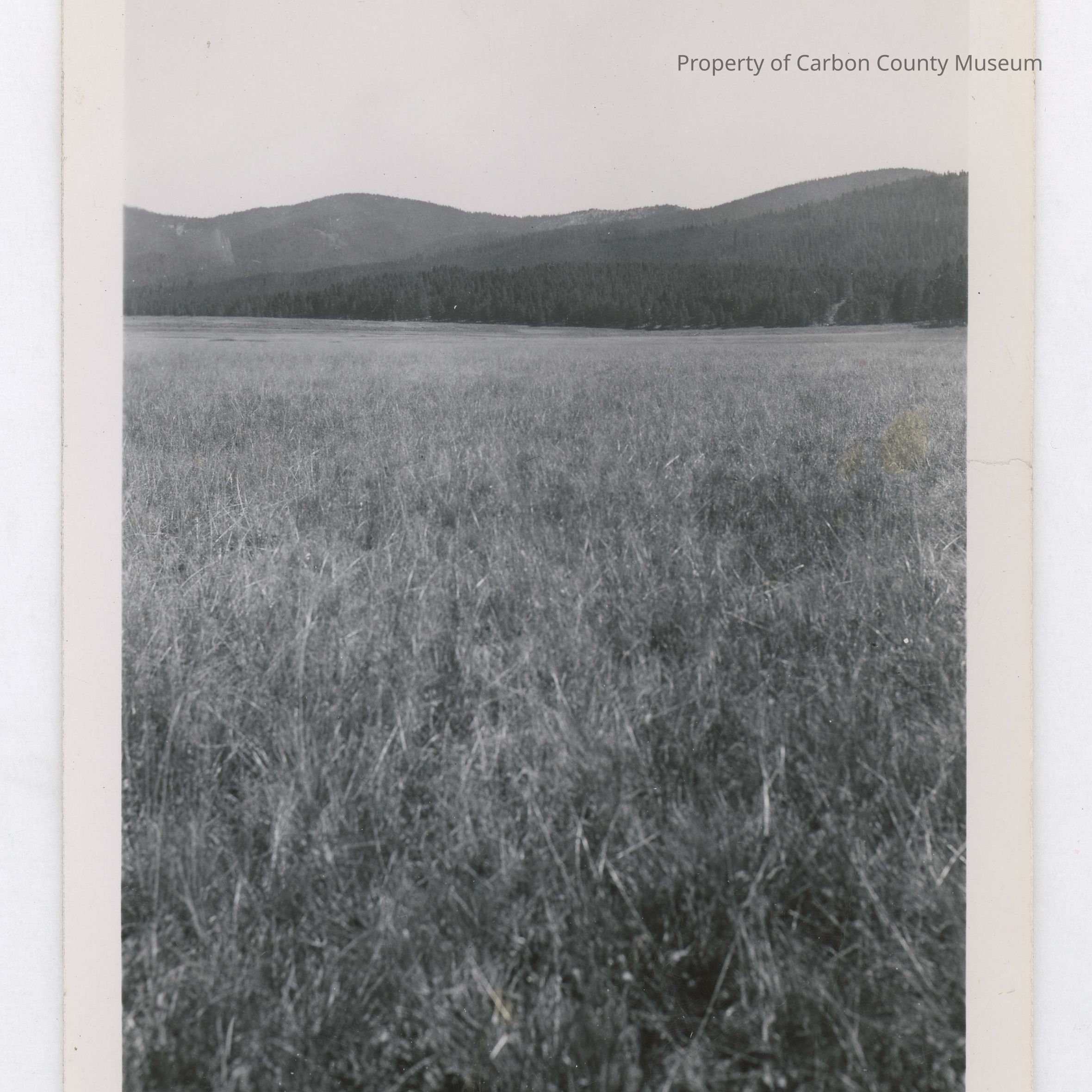 Update 2009: Black and white print of tall grass field. Hills and trees in background.
