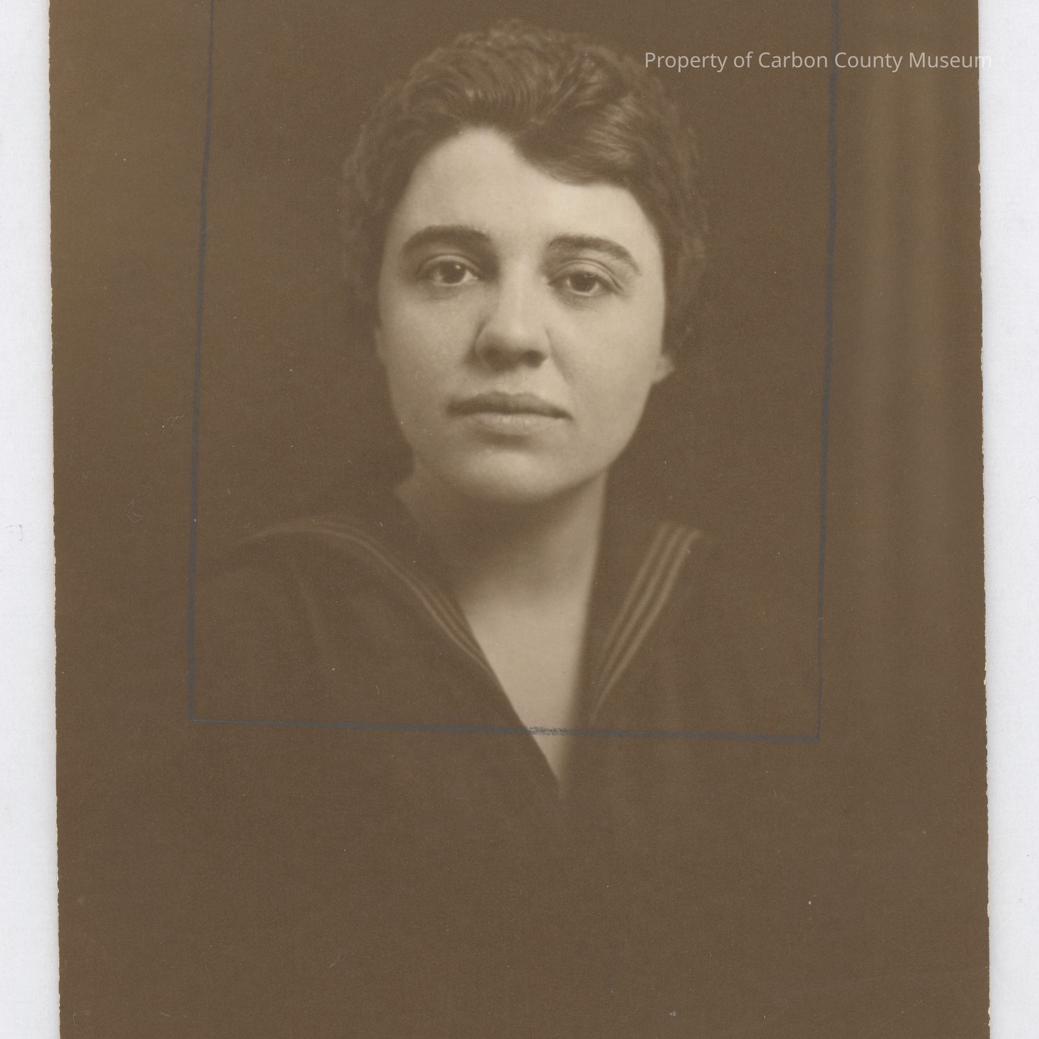 Update 2009: Black and white print of head and shoulders of woman wearing a dark suit with sailor collar. She has short dark hair, heavy eyebrows, and large lips. Written on back in blue ink:"Anna Pearl Rice". "Auburn, Ill.". Written on back in pencil: "Graduate-Public School Music" "Cincinnati Conservatory of Music" "Graduate Public School Music and Art" "Thomas Normal Training School Detroit, Mich". A square is drawn around face on print front. Written in pencil on back across "2 in". Up and down" "2 1/2 in." "120 screen oval". Condition good. Edges and corners worn, paper missing, drawing on front.Collection