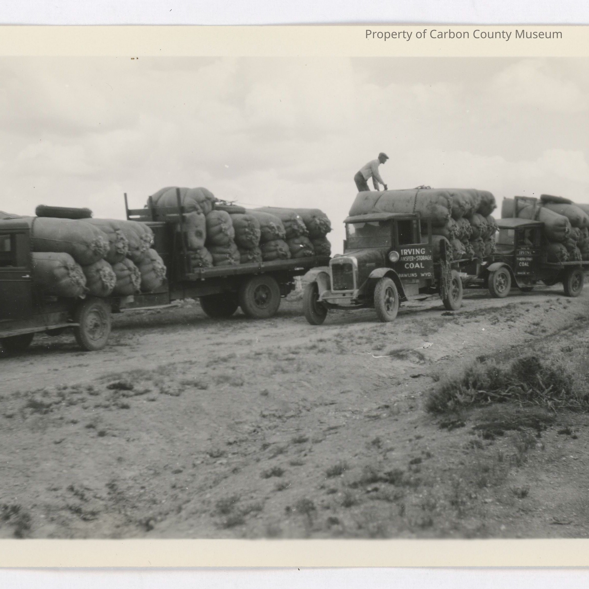 Update 2010:: Four vintage trucks, cab of one behind another, all loaded with large bulging sacks. Trucks are setting on a dirt road and there are two men, one on top of the second truck adjusting a chain. Second man walking beside third truck carrying unidentified object. Painted on door of second and third trucks: "Irving Transfer & Storage" "Coal" "Rawlins, Wyo" Condition good. Scratched. Size 3 1/2 x 5 3/4.Collection